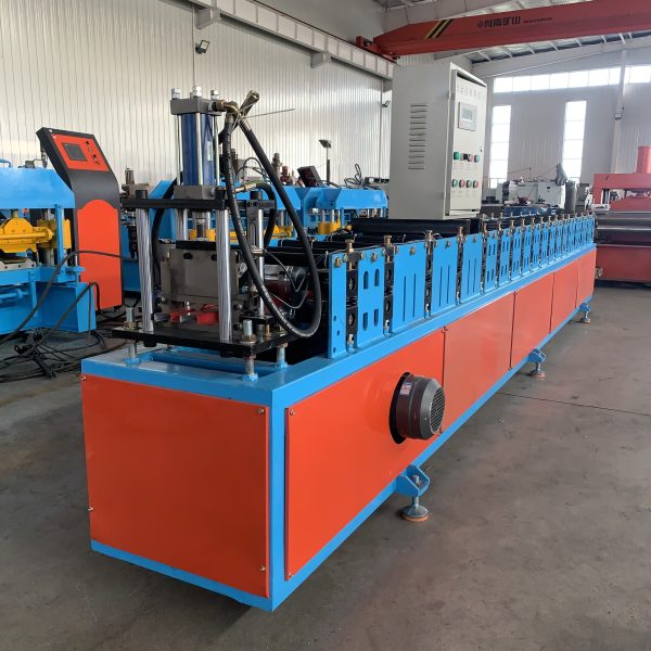 Manual uncoiler—feeding device—rolling form—speed, length, pieces set by PLC—hydraulic mold post cutting—collection table