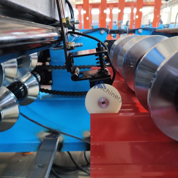 Manual uncoiler—feeding device—rolling form—speed, length, pieces set by PLC—hydraulic mold post cutting—collection table